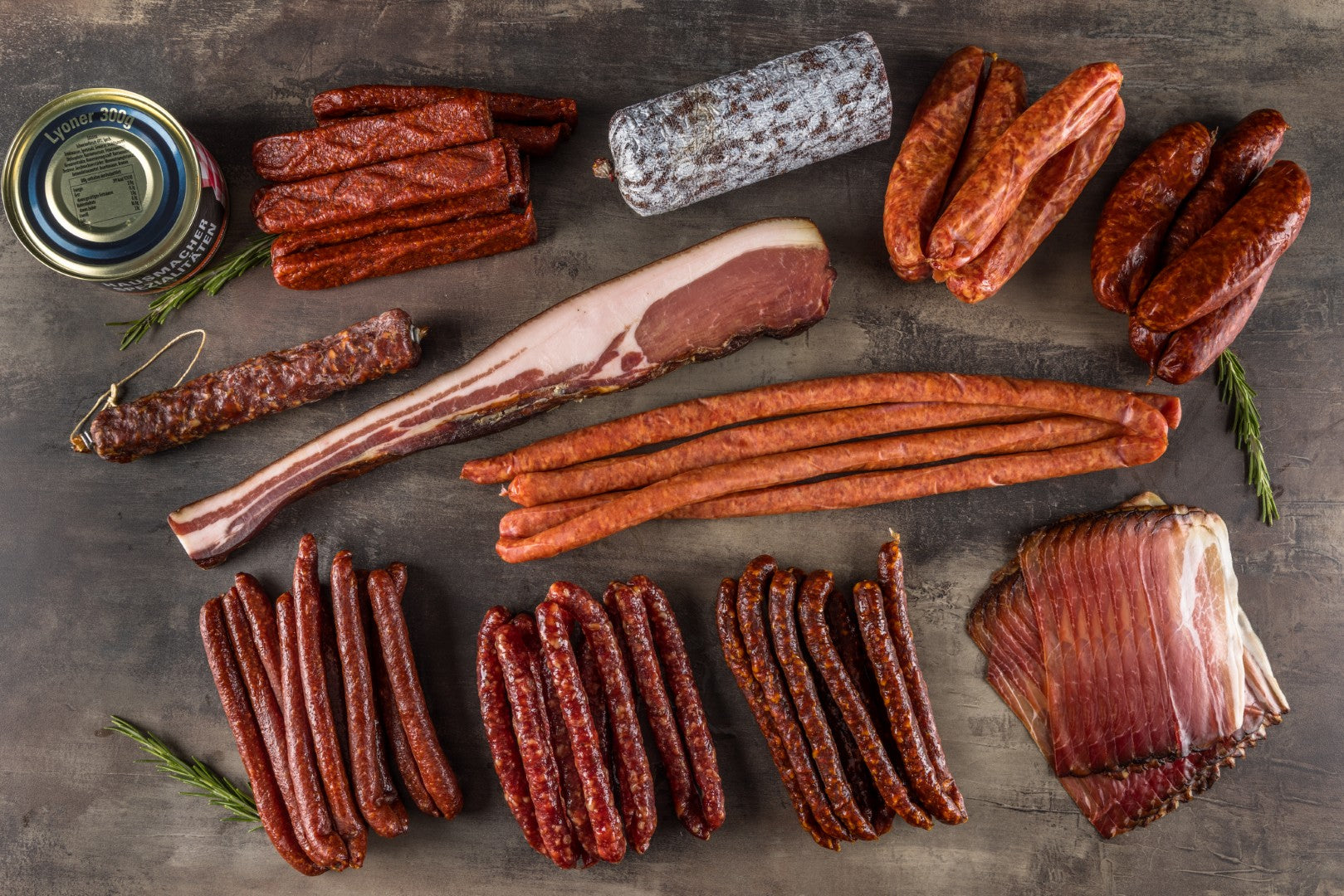 Landjäger: Rechteckig gepresste, halbtrockene Würste aus gleichen Teilen Rind- und Schweinefleisch, gewürzt mit Kümmel, Pfeffer, Koriander und Knoblauch; als haltbarer Snack ohne Kühlung beliebt.
